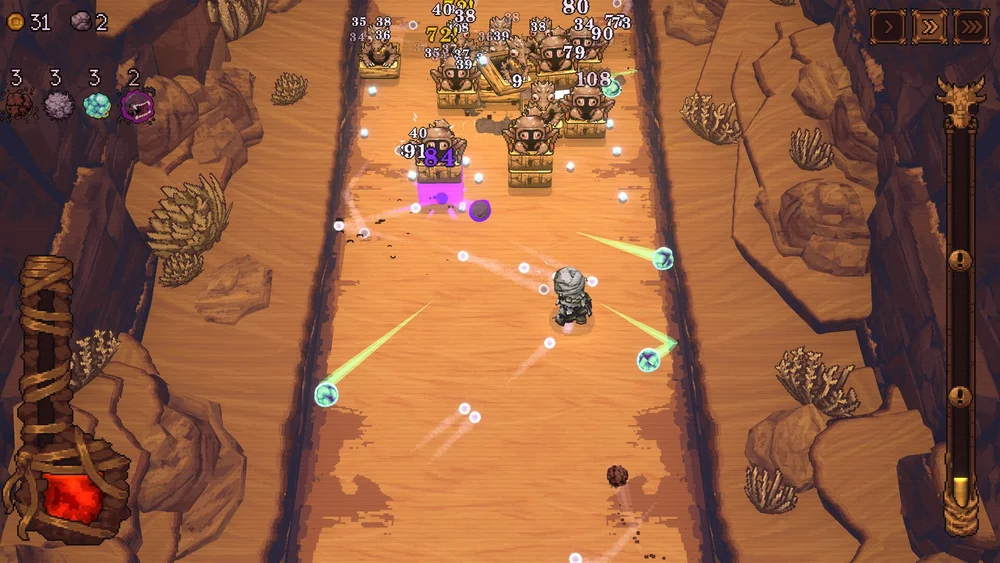 As of the latest update, there are 16 characters, and every one is worth using as they each have unique abilities that often drastically change their playstyle. Later on, you can even send two characters in simultaneously, which combines their abilities. My favorite warrior, The Falconer, fires balls from falcons on either side of the screen. The Juggler is also a top pick of mine – he launches balls by lobbing them in the air, so you can aim precisely where your shots land and even get behind enemy lines. Early on there’s The Disgraced Deputy, who auto-fires while moving at full speed, but shoots scattered shots (can’t aim precisely). The Cohabitants are a couple that shoots mirrored images of each ball at half damage – a great combination for certain levels. The Cogitator is great if you don’t want to think about upgrades, as he picks all of them for you. There’s even The Radical, who will simply play the game for you and select upgrades. He’s great if you just want to sit back and let the game play itself, or just see what choices a CPU would make.