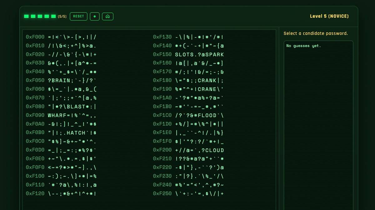 These minigames usually task you with finding a password in a huge jumble of random words and codes, with each guess telling you how many of the letters you’ve found are correct and in the right order.