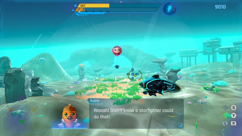 By the end of my playthrough, in addition to slowing down time, my Overdrive fully refilled my health and special weapon energy, plus gave my lasers a 260-percent damage buff. Additionally, each time you level your relationship with a specific character, you get a touching post-mission scene between Robin and that character. These scenes go a long way towards establishing personalities, connections, and narrative subplots, which is all extremely helpful since your squad mates’ voices play as gibberish rather than real voice acting. This isn’t a dealbreaker by any means, but when Star Fox 64 was able to have fully voiced characters in 1997, it’s disappointing to have to take my eyes off the action to read what they’re saying while in a mission.
