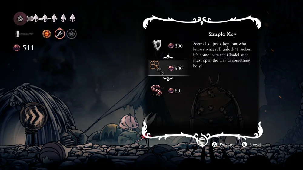 The Simple Key unlocks certain doors. But only one key is initially available, so choose your unlock carefully. If you can tolerate Hornet’s pogo, save it for later.