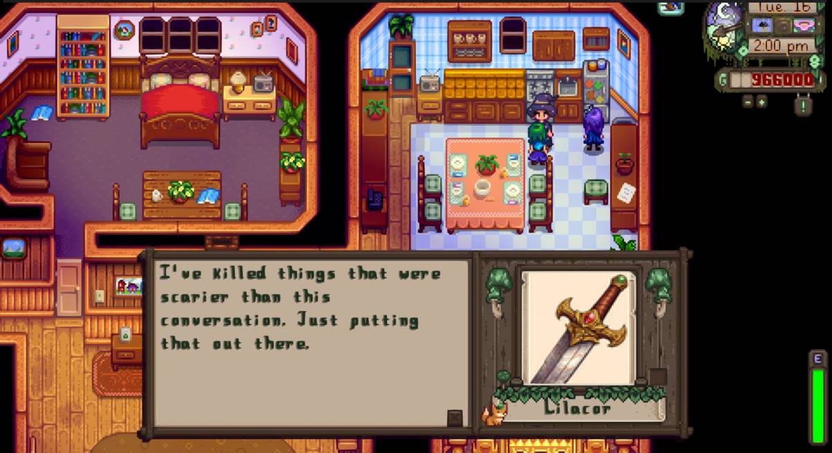 “Lilacor is an enchanted sentient weapon with an ancient and extremely complicated relationship with his own legacy,” reads the mod description. “He has been in wars. He has sacked cities. He has attended the fall of empires. He is currently on your farm watching you water parsnips and he has a lot to say about it…and everything else.”