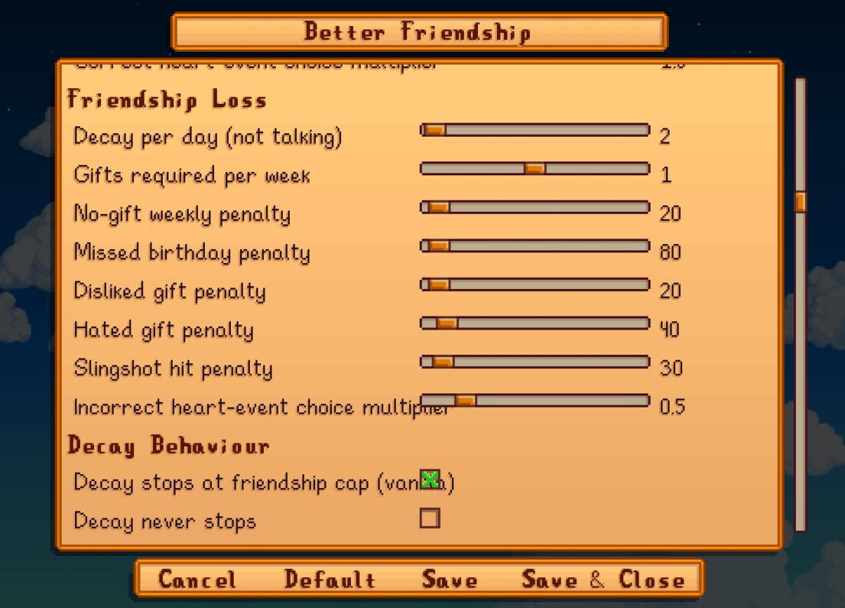 You can also tweak the friendship decay that comes about as a result of not talking each day. On the other hand, you can also change the friendship gain that occurs when sending a gift, talking to them, or taking them out on various events.