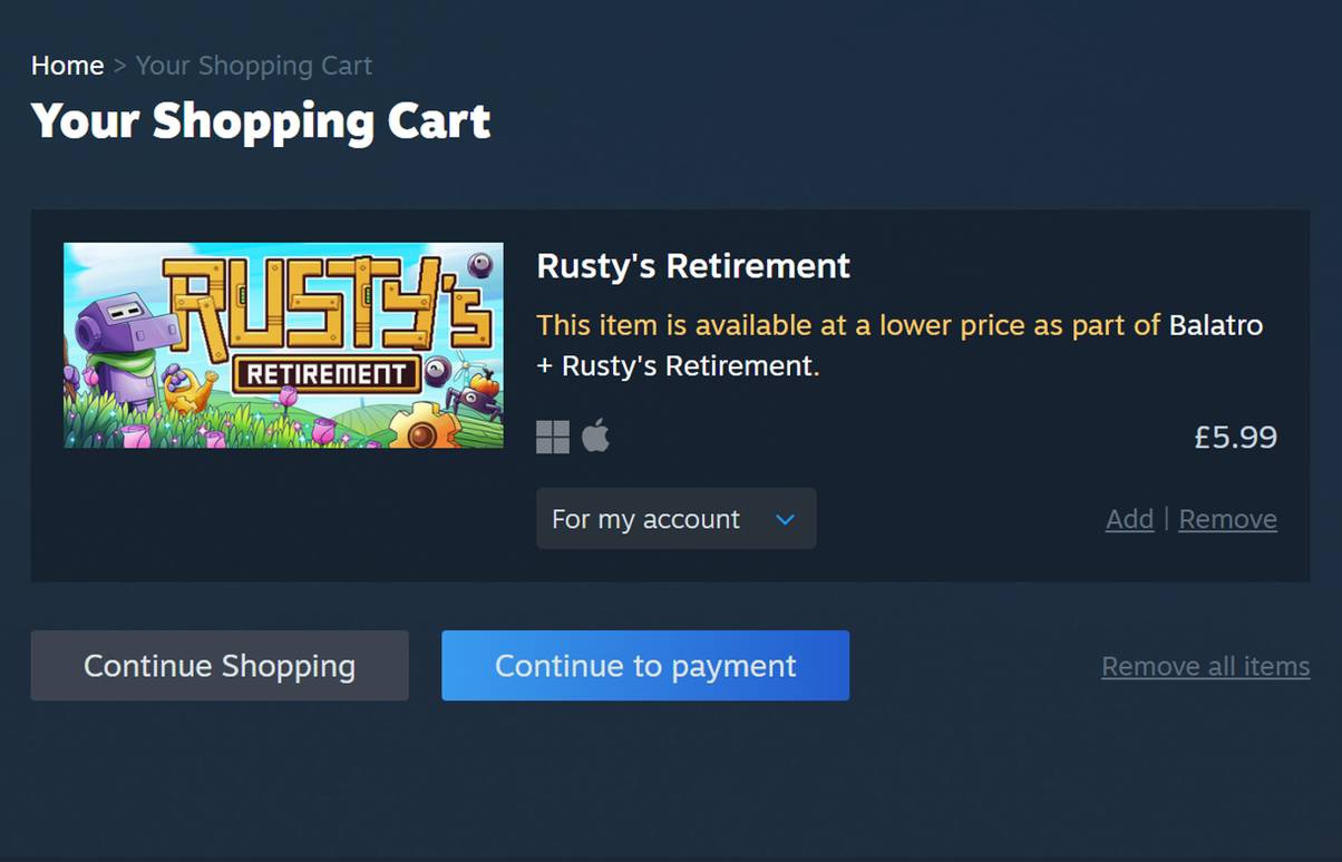 I already own Balatro, so because I went to purchase the game Rusty’s Retirement, which is contained within the Balatro + Rusty’s Retirement bundle, Steam has let me know that I could have saved a whopping 60 pence by opting to buy the bundle instead.