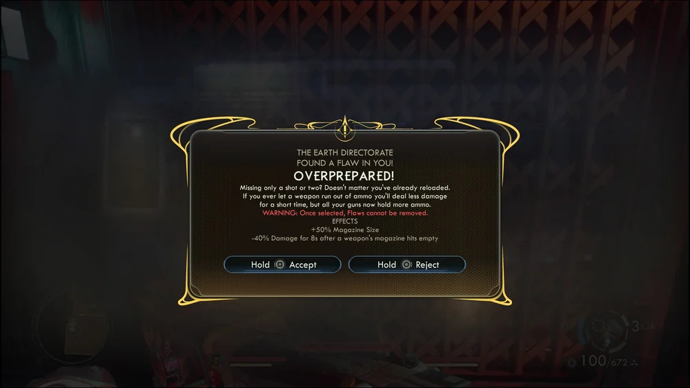 Another addition to spice up character builds is Flaws, passives that always come with a drawback, but add more personality to your playthrough. I’ve accepted flaws such as being addicted to drugs, the fear of robots (20% more damage from robots, but I deal 20% more to them), or more comedic ones, such as my character randomly stealing anything nearby without me knowing, granting me a high chance of getting caught for stealing. The Bad Knees popped up for me. It’s a funny addition as each time I crouch, then stand up, it triggers a sound that alerts nearby enemies. There’s a lot of these that pop up, and thankfully, you can choose to accept or deny them.