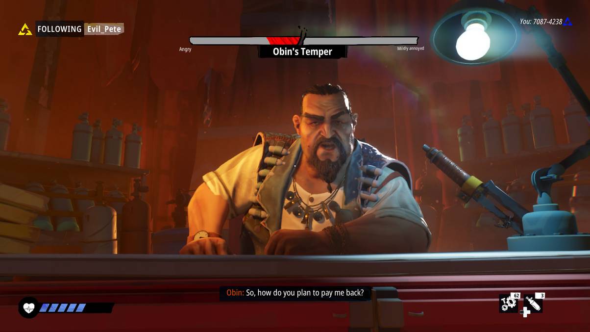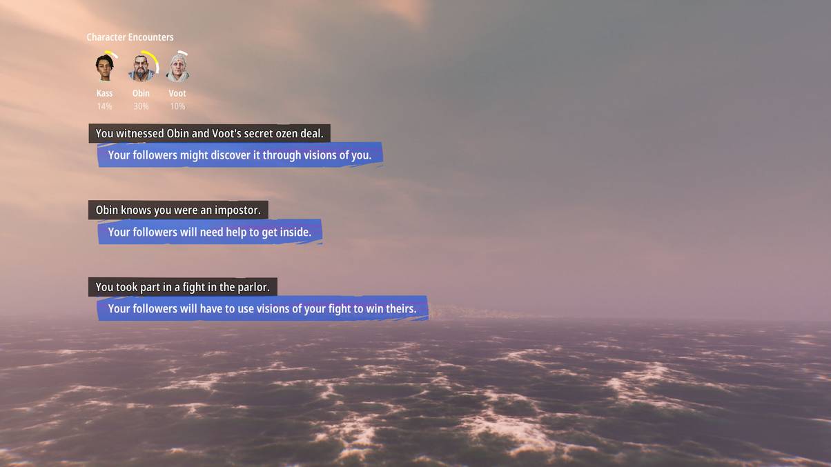 For another, more dramatic example, there’s a situation early on where you need to obtain some Ozen from a settlement ruled by a ruthless gangster named Obin. When I first showed up, the place was on high alert due to my predecessor having stolen the Ozen when they were here. That resulted in the place being locked down and guards patrolling the area. However, I was able to convince Obin to stop looking for the thief, at which point I was informed that my actions have led to my followers being welcomed to the settlement without any major guard attention.