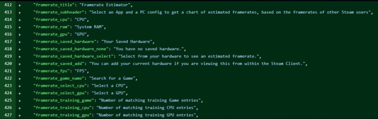 Dex3108 shares an image showing some of the new strings that have appeared, with an entry labelled as “Framerate Estimator” appearing at the top. This is followed by a subhead which says “Select an App and a PC config to get a chart of estimated framerates, based on the framerates of other Steam users.”