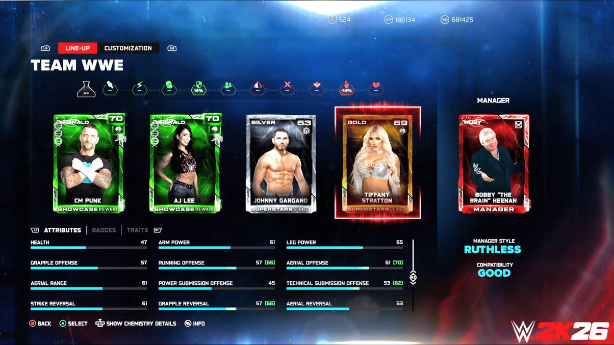 One of the new mechanics for MyFACTION cards is chemistry. My initial assumption is that this might be similar to Ultimate Team in EA Sports FC. In the EA game, stats will be boosted, such as speed, passing, and shooting, for players of the same team, same nationality, league, and so forth. But that’s not quite how it works in WWE 2K26.