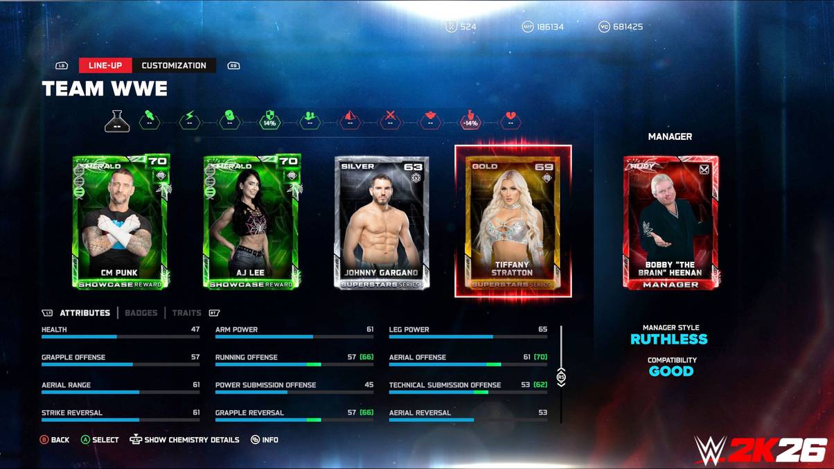 New features to MyFACTION include its chemistry system. If you have a random faction of WWE Superstars, they might have low chemistry, and this could impact a match with a teammate refusing your tag and walking away. With good chemistry, such as members of The Bloodline or Judgement Day, thereâs a random chance that an AI-controlled teammate might run in during a match to help you out.